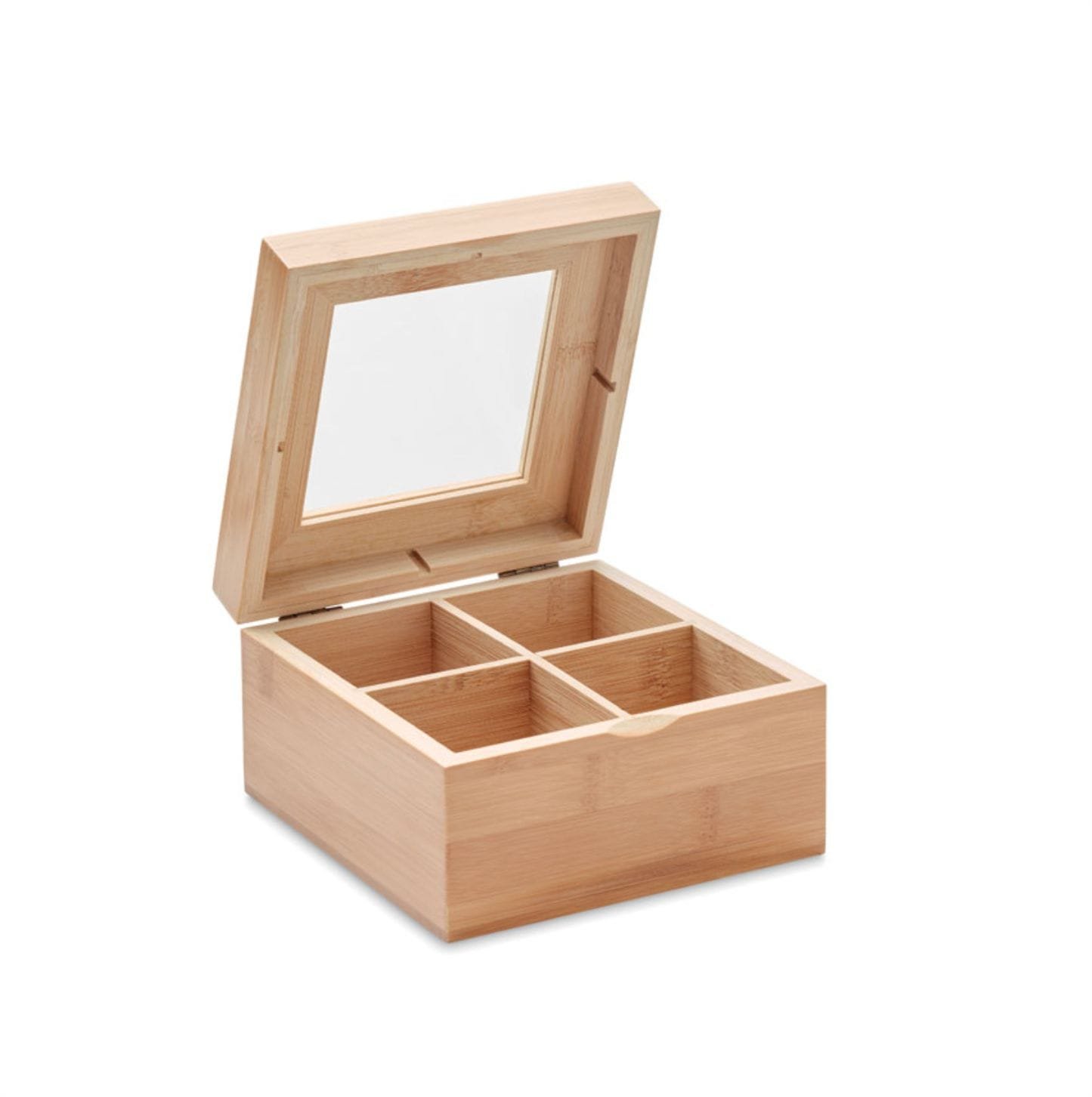 Bambukinė arbatos dėžutė su skaidriu stikliniu dangteliu.