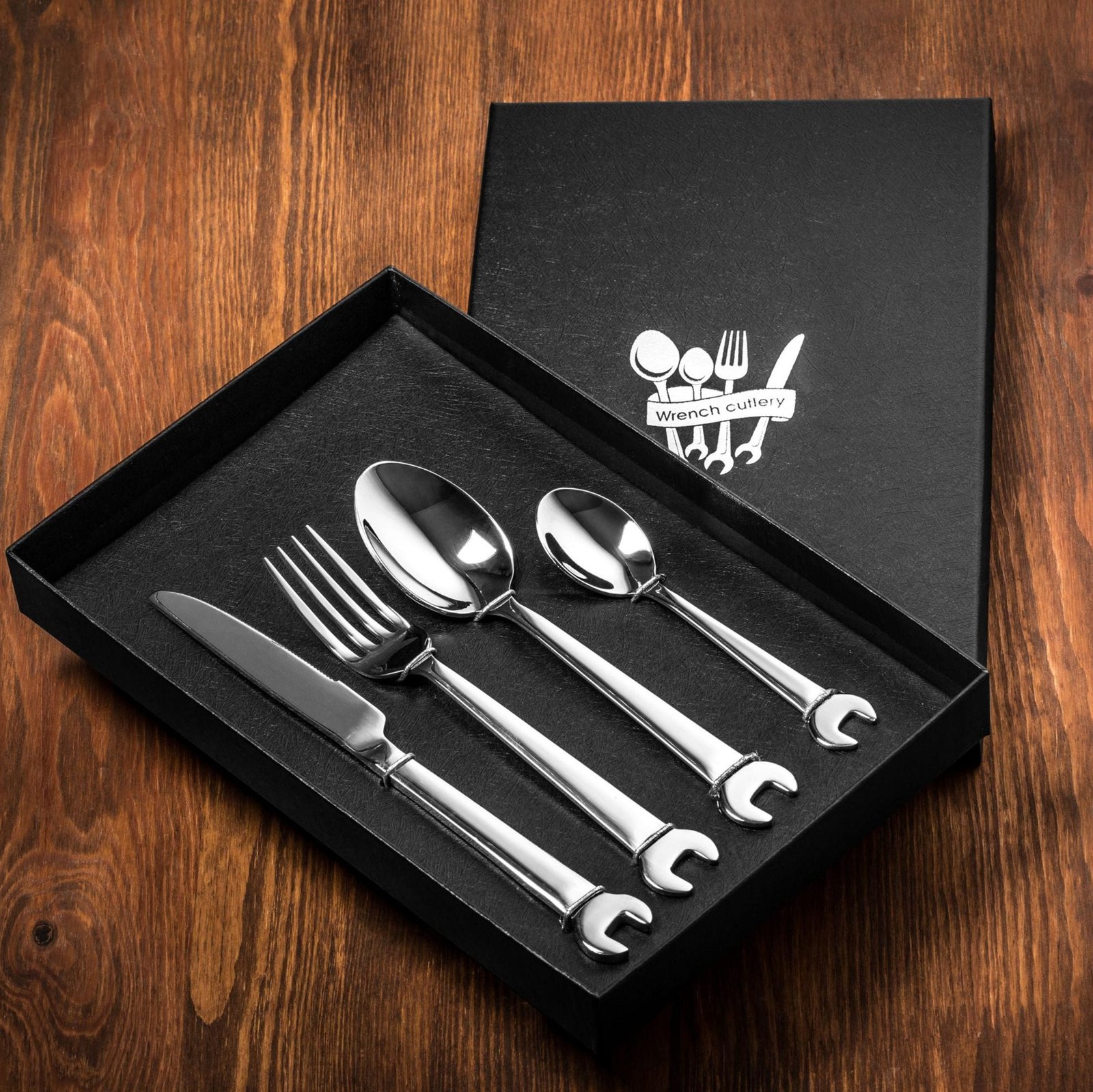 Rinkinį sudaro: peilis, šakutė, šaukštas ir arbatinis šaukštelis, visi su veržliarakčio galvute