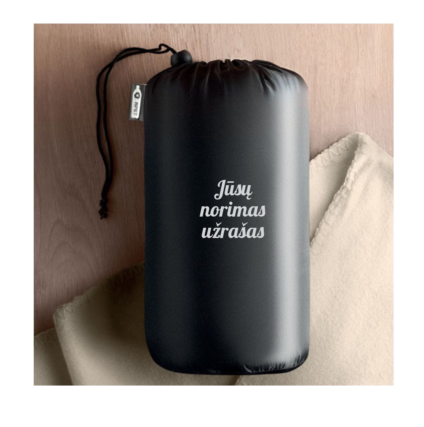 Pledas su norimu užrašu ant maišelio arba ant pačio pledo.