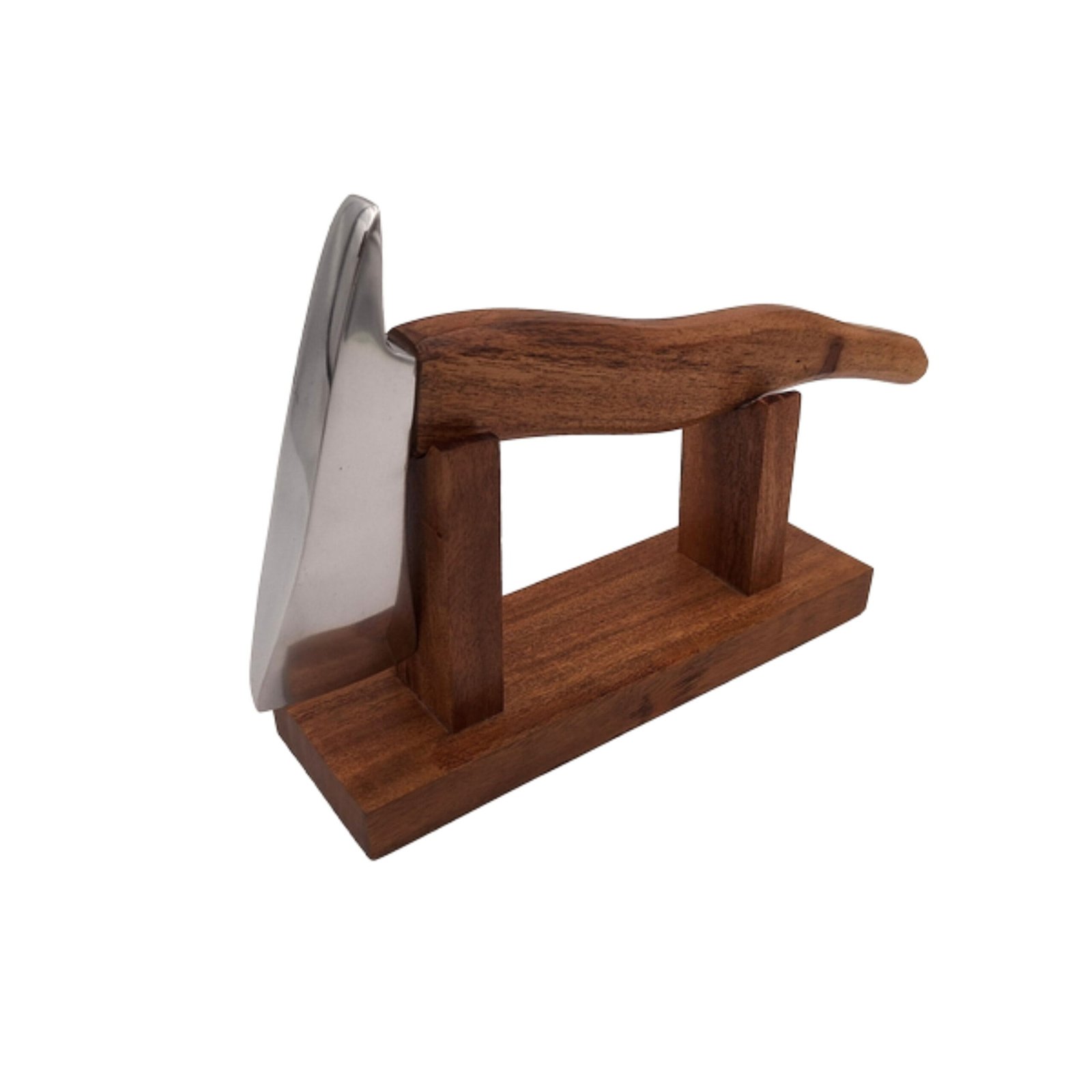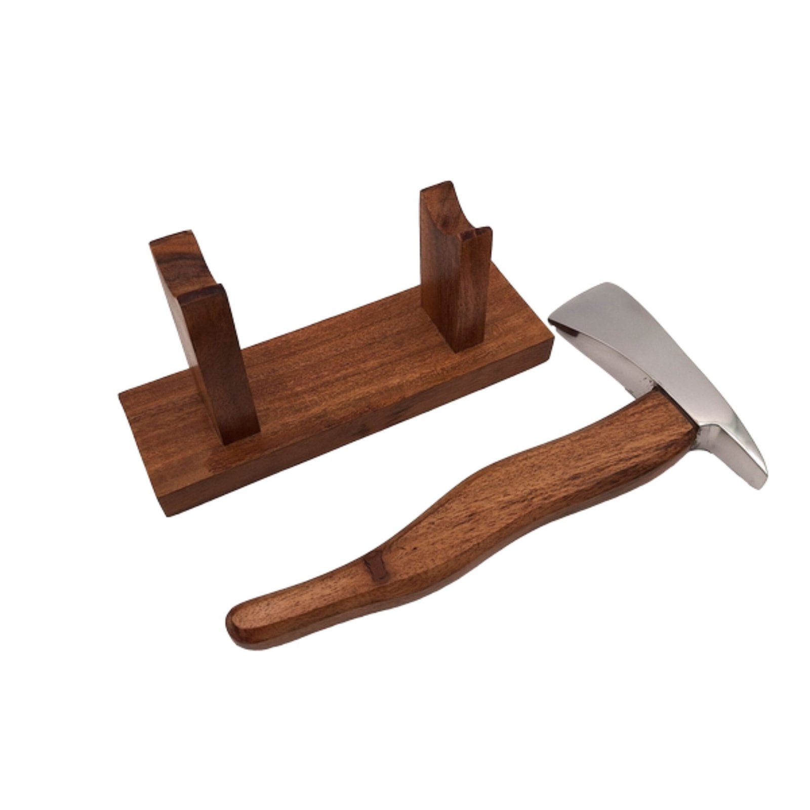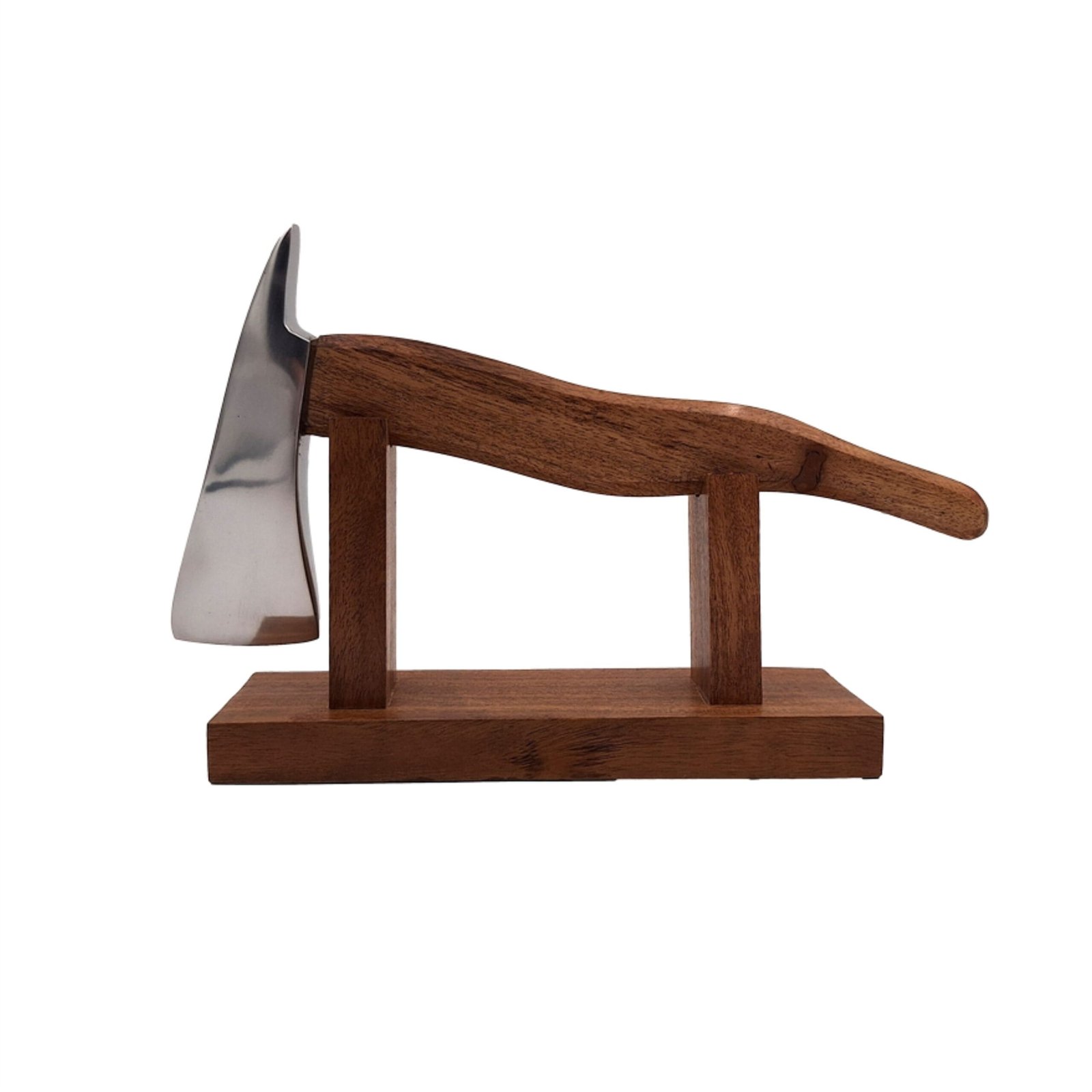 Metalinis ugniagesio kirvis su mediniu kotu, uždėtu ant medinio pagrindo. Kirvis – puiki dovana ugniagesiui.