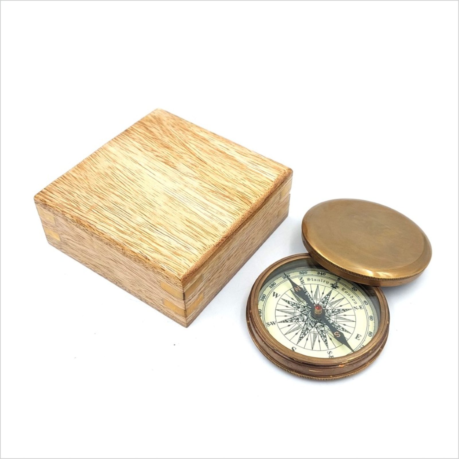 Kompasas supakuotas į medinę dėžutę, išklotą audiniu.