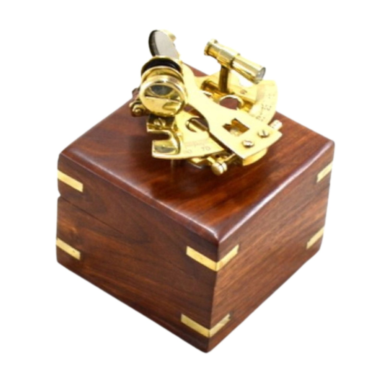 Mažas žalvario sekstantas medinėje dėžutėje yra puiki dovana jūreiviui ir jūrininkui.