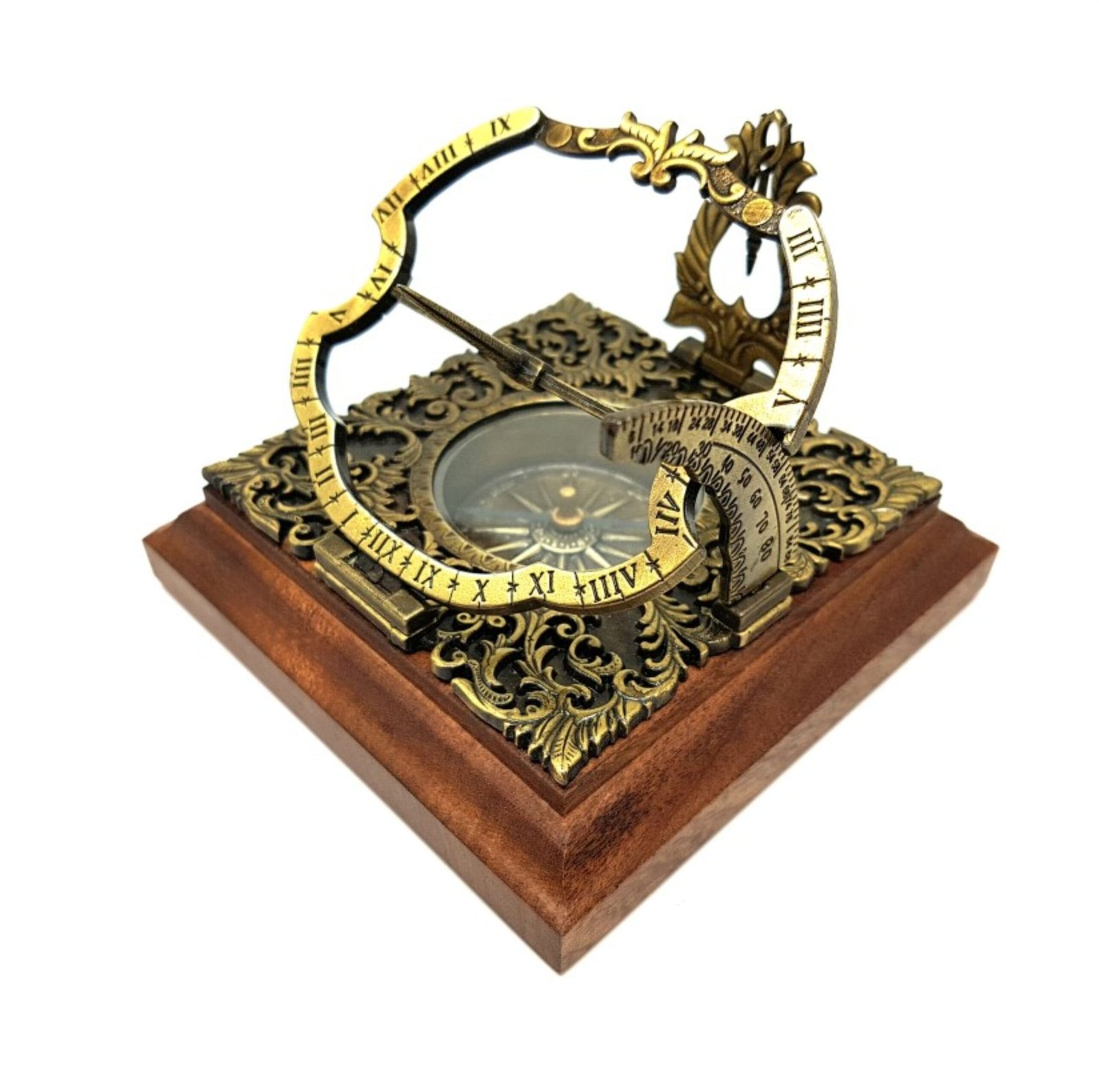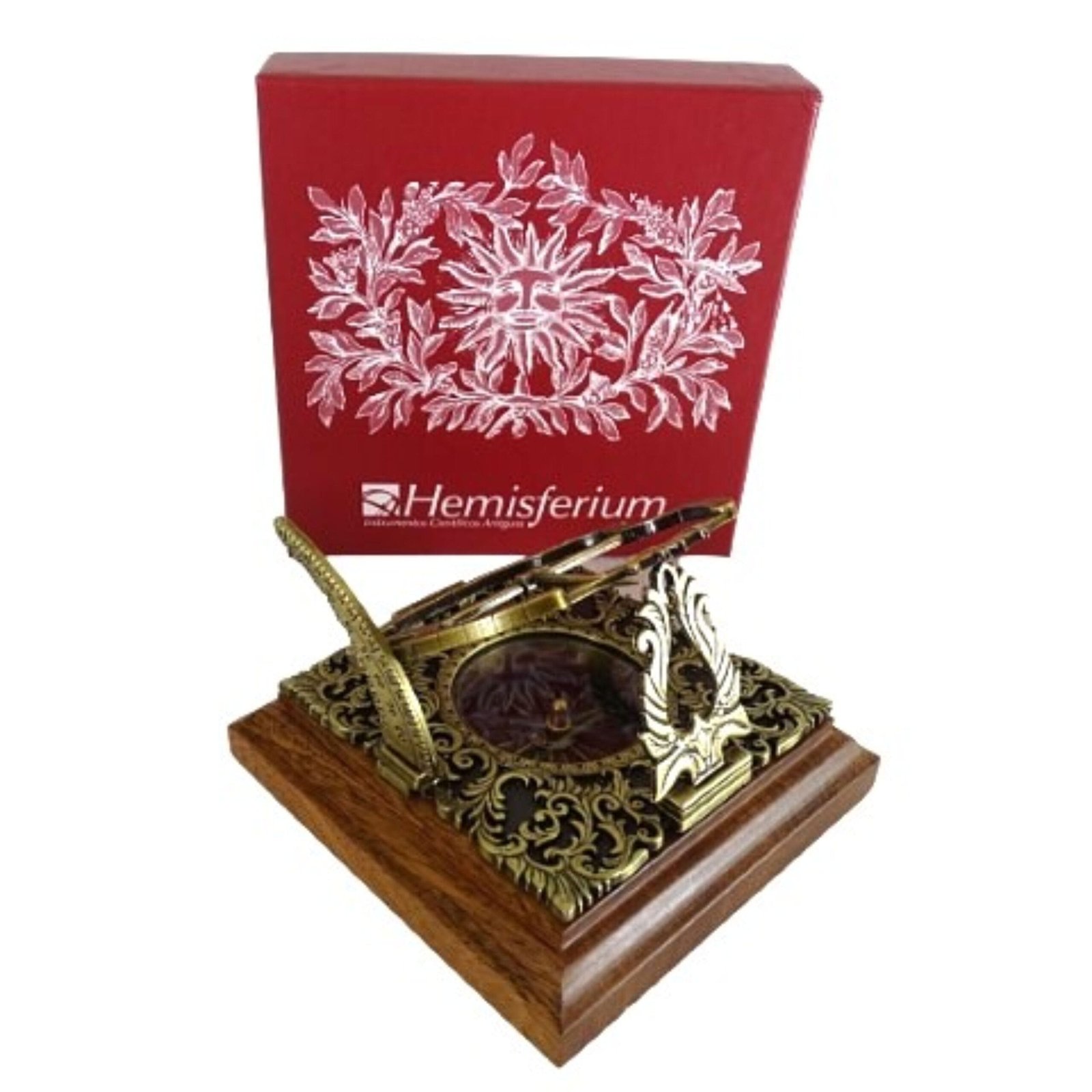 Viršutinė instrumento dalis yra saulės laikrodis, po kuriuo yra kompasas.