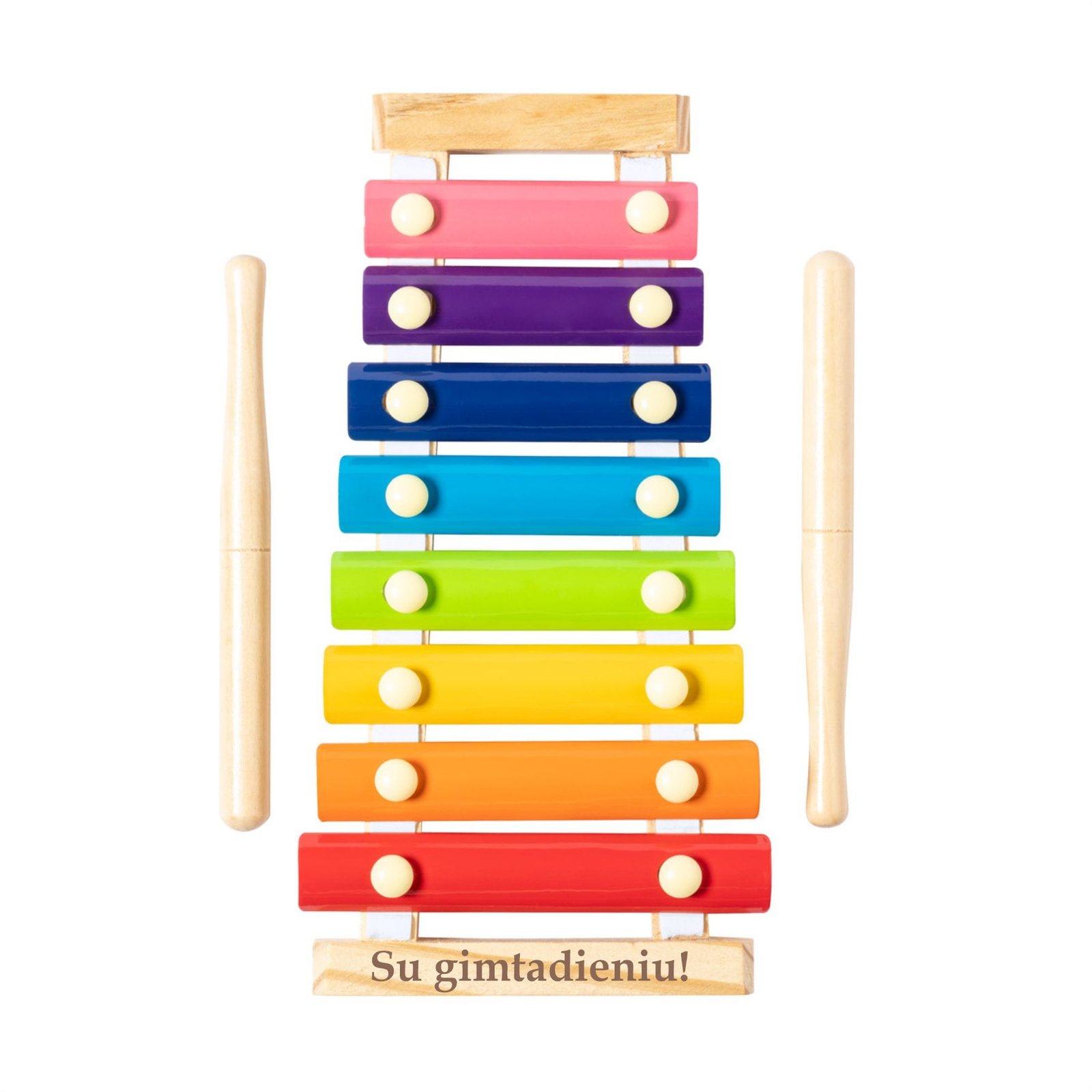 Medinis ksilofonas su būgnų lazdelėmis ir įvairiaspalviais metaliniais klavišais.