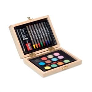 Mini menininko rinkinys medinėje dėžutėje, kurį sudaro 8 kreidelės, 12 akvarelių, 1 teptukas, 1drožtukas, 1 trintukas ir 1 pieštukas.